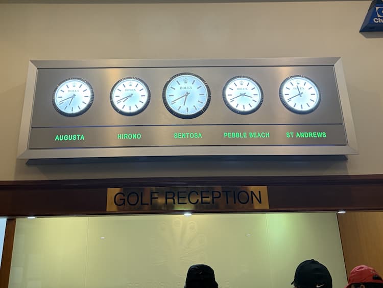 グラブ内にあるフロントには、世界の名だたるコースの時間を示す時計が飾ってありました。否応にも名門を意識せざるを得ません、、、