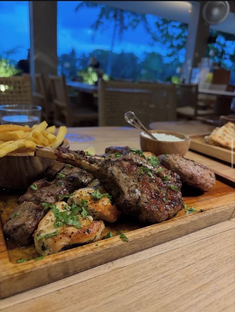 夕方からはビーチ沿いのレストランで食事です。日中の暑さが和らぐテラス席でギリシャ料理とお酒を堪能します。