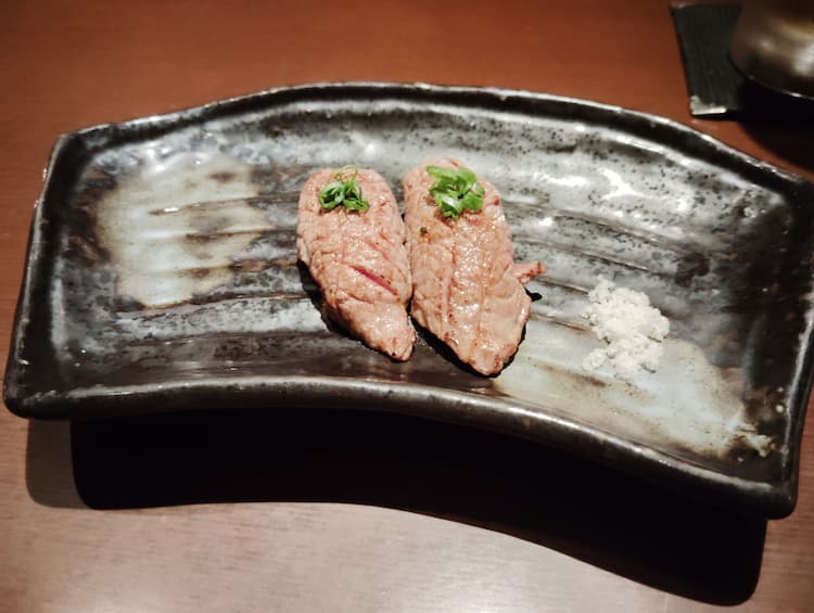 コースの一部を紹介させていただきます。こちらは仙台牛炙り寿司。肉厚で柔らかく、ごはんとお肉の温度差がなく、とても温かで一体感のある優しいお味でした。